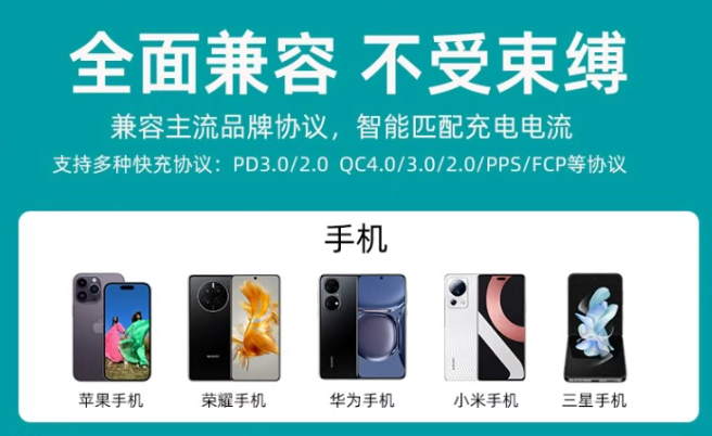兼容主流品牌協(xié)議 PD3.0/2.0 QC4.0/3.0/2.0/PPS/FCP協(xié)議。 智能匹配充電電流。